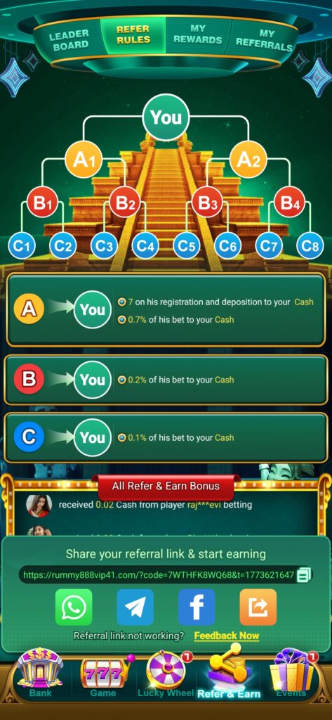 Friends, if you share the rummy888 game with any of your friends, if he downloads it, you will get a free bonus of ₹ 50 on referral. If he makes a deposit and plays, you will get an extra bonus of 10% on the deposit and on every bet, you will get an extra reward of 3% to 4%You can easily withdraw money from your bank account.