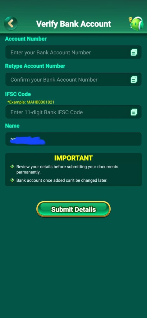 Friends, it is very easy to withdraw your money from rummy888 game. To withdraw your money from this game, first of all you have to fill some bank details, first of all you have to enter your account number, after that you have to enter IFSC code, after that you have to enter your account holder name, after that submitAfter doing this, you can now withdraw your money easily.